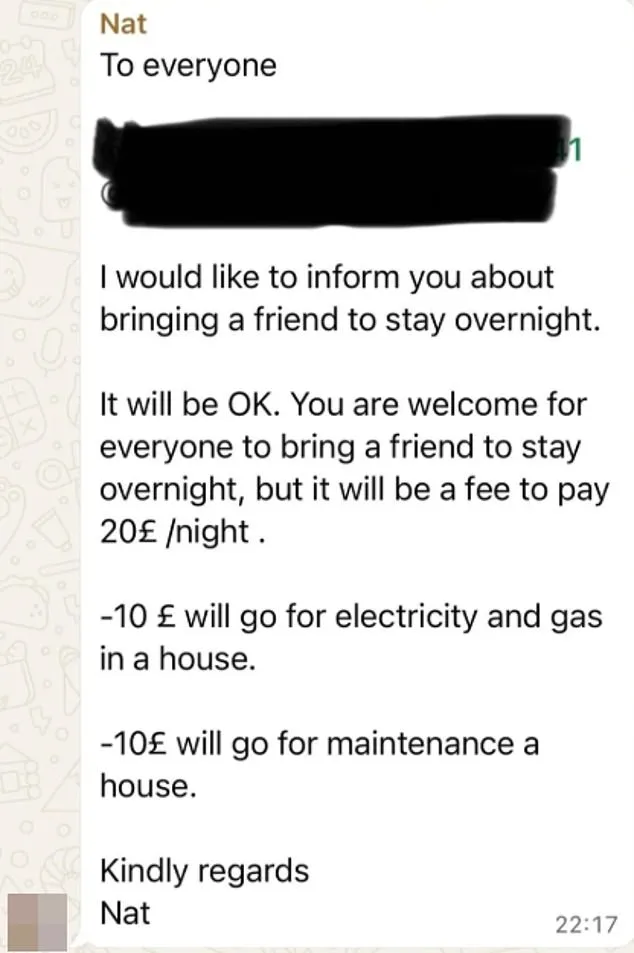 ‘You are welcome for everyone to bring a friend to stay overnight, but it will be a fee to pay £20/night,’ she continued.