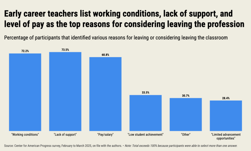Lack of resources and preparation, low pay and working conditions such as issues with student behavior are the top reasons why nearly 70% of early-career teachers are on their way out of the classroom, according to a new survey from the Center for American Progress.